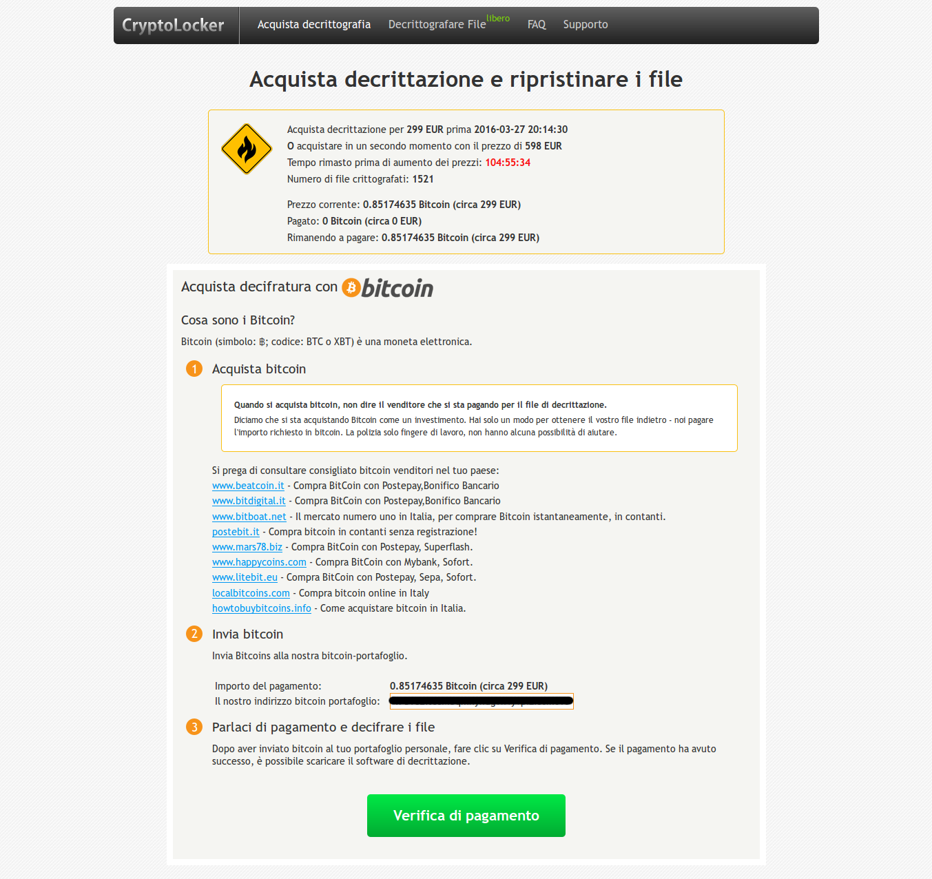 Le immagini qui sotto sono semplici foto di schermate scattate da un vero sito per il pagamento con Cryptolocker. Potete visionarle senza pericoli, non sono rimandi al vero link!