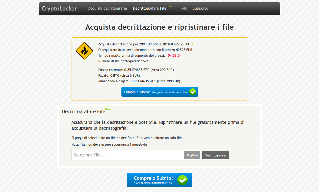 Vi compariranno i dettagli per pagare il riscatto. Potrebbero essere presenti codici che permettono al malfattore di verificare lo stato del virus sul vostro computer. Appena visiterete il sito, partirà un timer legato al tempo che avete per pagare. Al termine del conto alla rovescia Ci potrebbe essere un secondo step con un prezzo aumentato, successivamente il truffatore rimuoverà la vostra "chiave di decodifica" per decriptare i file dal suo sistema. Ripeto che spesso capita che non vi verrà ridata nessuna chiave per decifrare i vostri file anche dopo il pagamento, ricordatevi che state facendo affari con dei criminali; io eviterei di pagare. Per i curiosi che vogliono evitare di cliccare sul sito, ho inserito qui sotto degli screenshot del sito e il file che compare in ogni directory criptata da Cryptolocker.